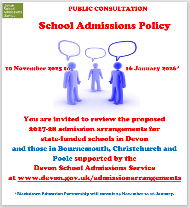 Consultation on admission arrangements 2027/2028. Consultation period 10.11.25 - 16.01.26 Please see details below: